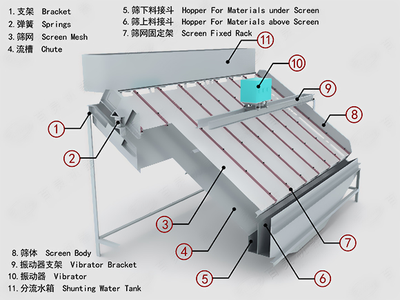 高頻篩采用了高頻率,一方面破壞了礦漿表面的張力和細粒物料在篩面上的高速振蕩,加速了大密度(比重)有用礦物和析離作用,增加了小于分離粒度物料與篩孔接觸的概率。從而造成了較好的分離條件,使小于分離粒度的物料,特別是比重大的物粒和礦漿一起透過篩孔成為篩下產(chǎn)物。